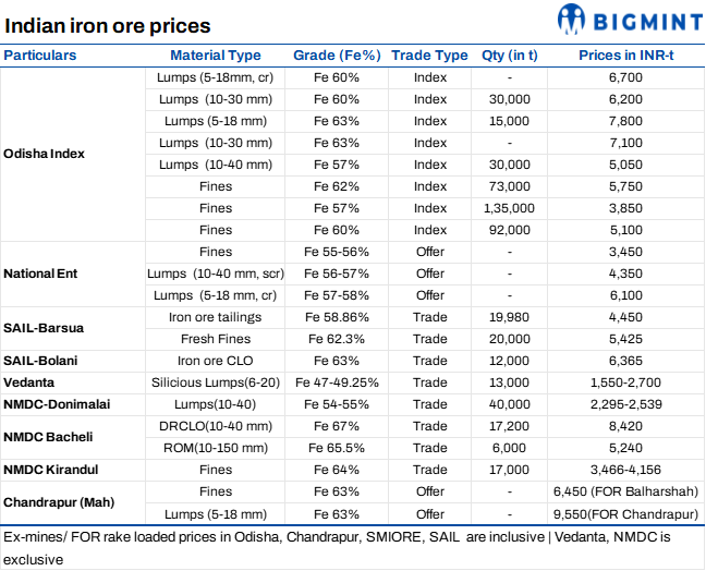 OMC scheduled an auction for 3.412 mnt of iron ore (1.44 mnt lumps and 1.972 mnt fines) today. The miner has increased base prices of lumps by INR 500/t, while fines prices rose by up to INR 250/t m-o-m. The upward revision follows similar price hikes by NMDC and Lloyds Metals by INR 450-550/t, reflecting improved market sentiment. OMC has restricted the participation of traders in e-auctions.