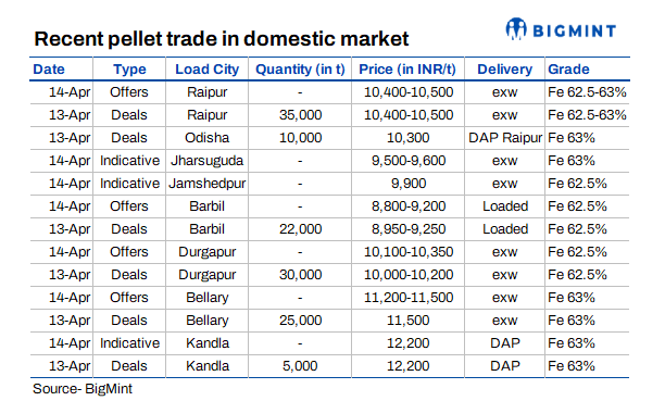 Pellet prices in the Raipur region declined by INR 300-400/t as assessed on 14 April, as local producers revised their offers downward in response to weakening market fundamentals. The correction follows last week's price increase, when producers had raised offers in line with higher iron ore prices announced by NMDC and Lloyds Metals for April deliveries. However, the market failed to sustain those elevated levels due to subdued buying interest.