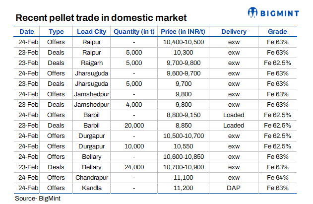 PELLEX, BigMint's bi-weekly domestic pellet (Fe 63%) index for Raipur, inched down by INR 50/t to INR 10,500/tonne (t) ($116/t) DAP on 24 February compared to the previous assessment on 20 February. Around 5,000 t of pellet (Fe 63%) were traded in the market at INR 10,300/t ($114/t) exw-Raipur.