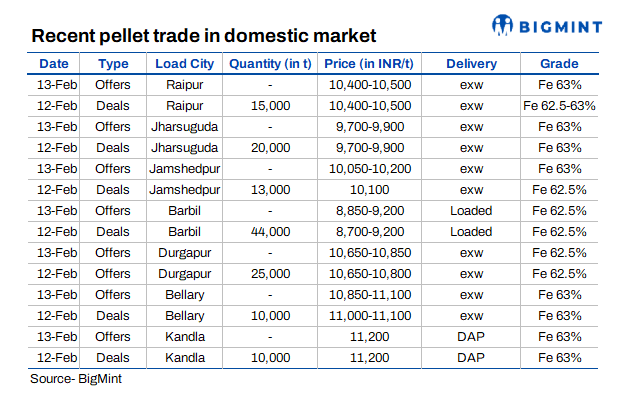 PELLEX, BigMint's bi-weekly domestic pellet (Fe 63%) index for Raipur, remained stable at INR 10,550/t ($117/t) DAP on 13 February compared to the previous assessment on 10 February. Around 15,000 t of pellet (Fe 62.5-63%) deals were concluded in the market at INR 10,400-10,500/t ($115-116/t) exw Raipur.