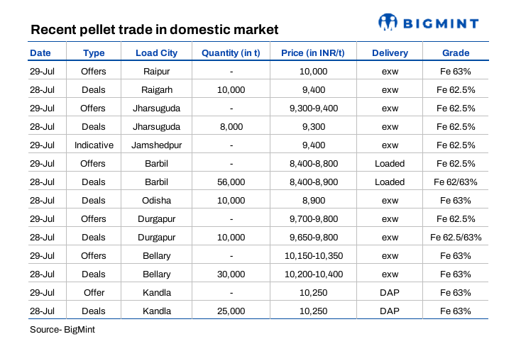 PELLEX, BigMint's bi-weekly domestic pellet (Fe63%) index for Raipur, inched up by INR 150/tonne (t) to INR 10,050/t ($116/t) DAP on 29 July 2025 compared to the previous assessment on 25 July.