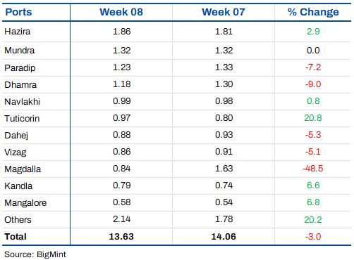 On the west coast, Magdalla saw the steepest decline of 48.50% to 0.84 mnt from 1.63 mnt, reversing last week's sharp build. Dahej decreased 5.26% to 0.88 mnt from 0.93 mnt, and Bhavnagar slipped 4.62% to 0.25 mnt from 0.26 mnt.