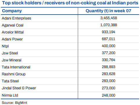 Adani Enterprise inventories increased 2.63% w-o-w to 3.46 mnt from 3.37 mnt. Agarwal Coal stocks declined 6.19% to 1.07 mnt from 1.14 mnt, indicating selective evacuation during the week.