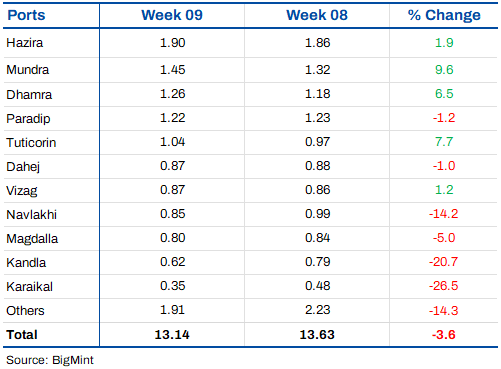 The overall decline reflected faster evacuation at select east coast ports, particularly Krishnapatnam and Gangavaram, along with corrections at Kandla and Mangalore. While Mundra and Dhamra saw fresh build-up, stock movement remained uneven across regions.