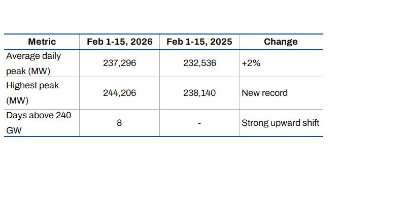 The distribution of peak days shows the most important insight: in 2025, none of the first 15 days crossed 240 GW. In 2026, more than half did. This indicates that the demand curve itself has stepped up rather than simply fluctuating around prior levels.