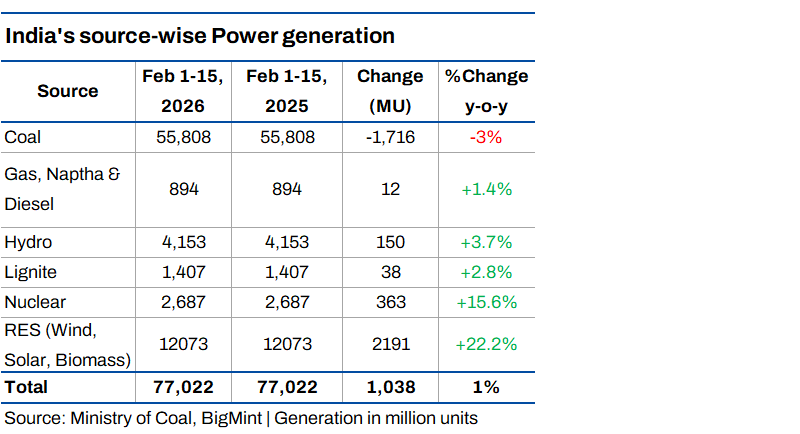 India: Power generation grows modestly y-o-y in early Feb'26, but fuel mix shifts markedly
