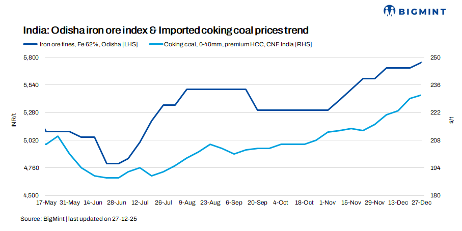 2. Raw material prices edge up w-o-w: Prices of major raw materials increased w-o-w, supporting BF rebar prices. BigMint's Odisha iron ore fines (Fe 62%) index edged up by INR 50/t ($0.55/t) w-o-w to INR 5,750/t ($64/t) ex-mines on 27 December 2025. Iron ore prices in Odisha remained largely firm w-o-w on 27 December, supported by active demand for fines from steelmakers, while lumps prices fell slightly amid weakening margins in the sponge iron (DRI) segment.