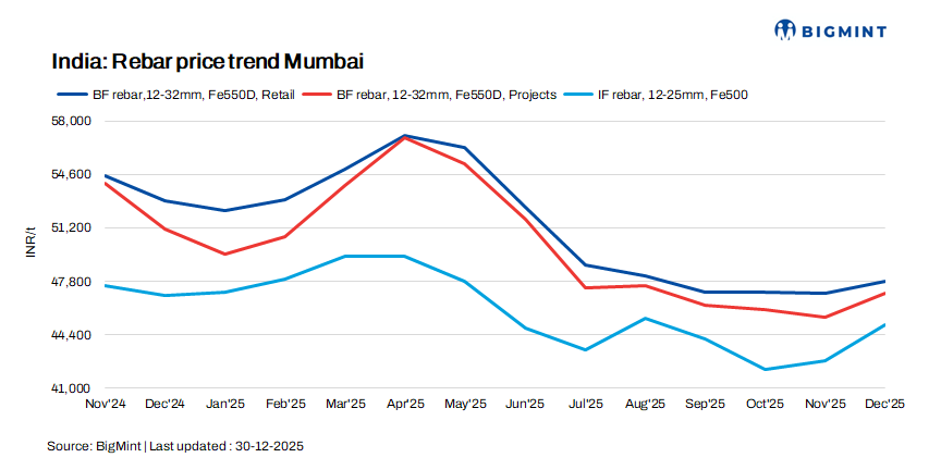 As of 31 December 2025, IF rebar prices rose by INR 1,700/t ($19/t) to INR 47,400/t ($528/t) exw-Mumbai as compared with last week's closing levels (as recorded on 27 December). Additionally, the near-term outlook remains positive, as mills have secured sufficient bookings for the coming days.