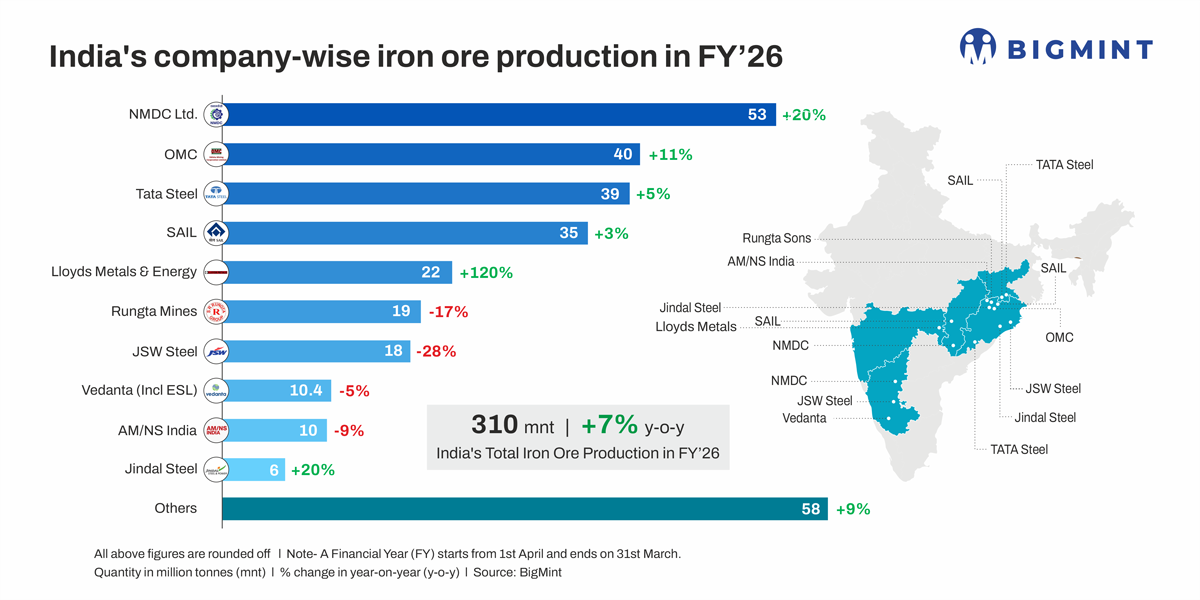 Morning Brief: India's iron ore production increased 7% year-on-year to 310 million tonnes in FY'26, as higher merchant output offset a decline in captive production. The increase reflects disruptions and transitional constraints across integrated producers, while merchant miners increased output, altering the composition of domestic supply.