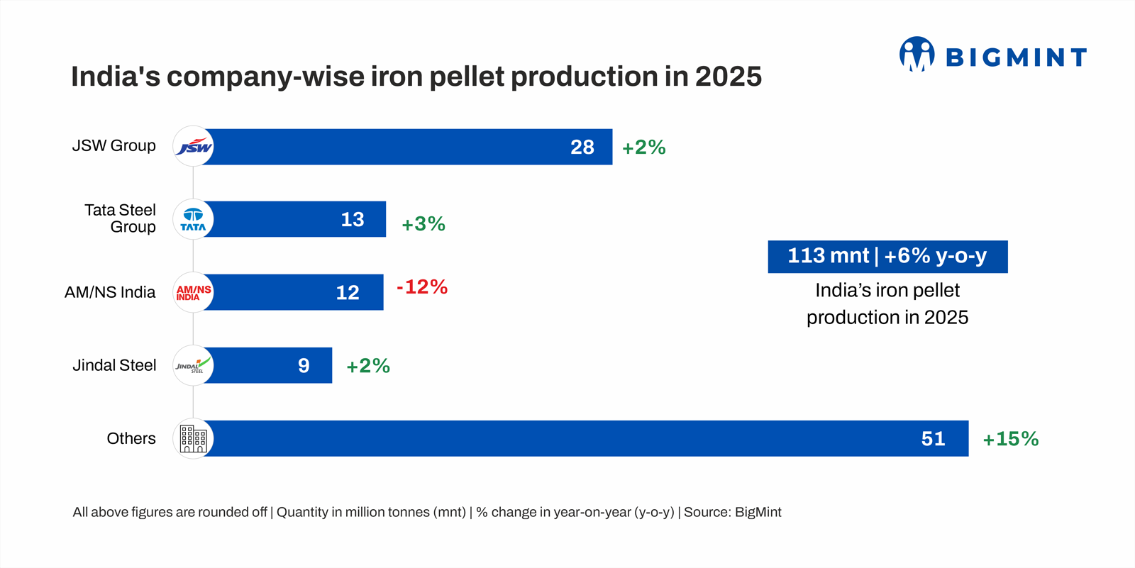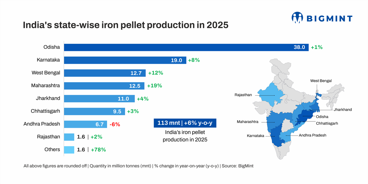 Morning Brief: India's iron ore pellet production increased by 6% y-o-y to 112.6 million tonnes (mnt) in CY'25, as per data maintained with BigMint. In the past few years, India's pellet production has accelerated rapidly with rising crude steel production and the growing need for energy efficiency in steelmaking.