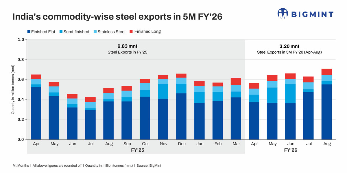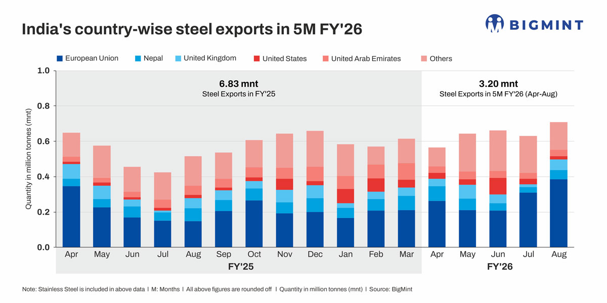 Morning Brief: Indias steel (including stainless steel) exports climbed up by a robust 22% y-o-y in April-August 2025 (5MFY26) to 3.20 million tonnes (mnt), as per provisional data maintained with BigMint. The rise comes on the back of a 32% increase in exports to the EU, as Indian mills pushed to complete their quotas ahead of the CBAM implementation in January 2026.