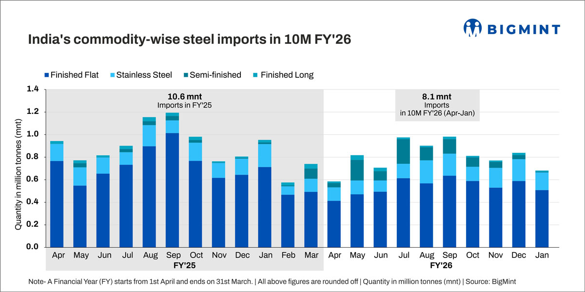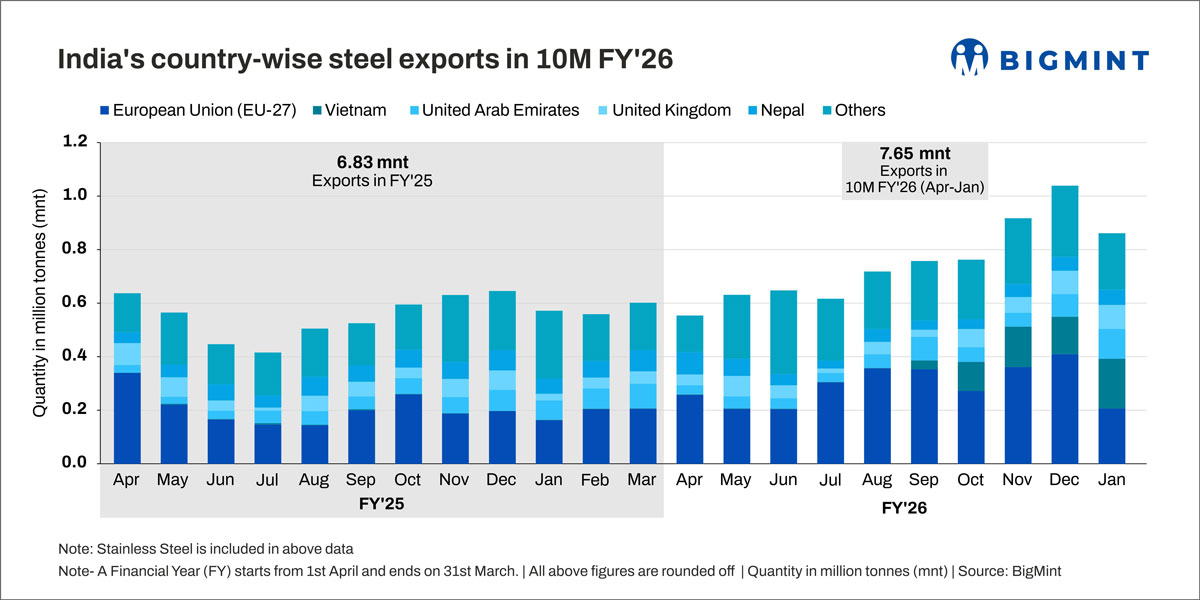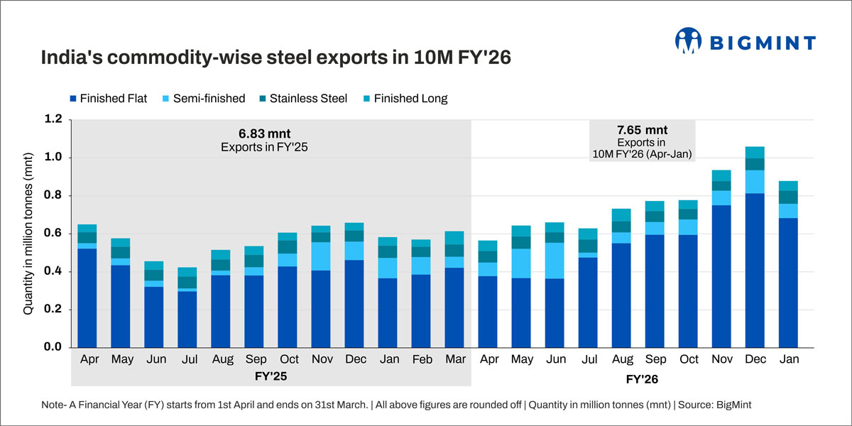 Morning Brief: India's steel exports (including stainless steel) surged by 36% y-o-y to 7.65 million tonnes (mnt) in April 2025-January 2026 (10MFY'26), as per provisional data maintained by BigMint. From August 2025, India's steel exports have exceeded 0.7 mnt every month, even reaching over 1 mnt in December, primarily driven by frontloading of shipments to the EU.