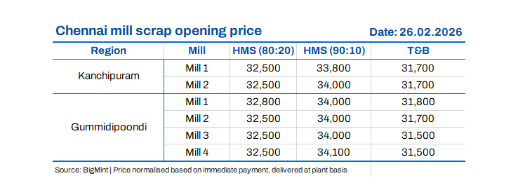 In the Chennai market, HMS (80:20) scrap prices rose by INR 600/t on a w-o-w basis to INR 32,500/t on 26 February 2026, driven by steady buying activity, while prices remained flat on a daily basis, according to BigMint assessment.