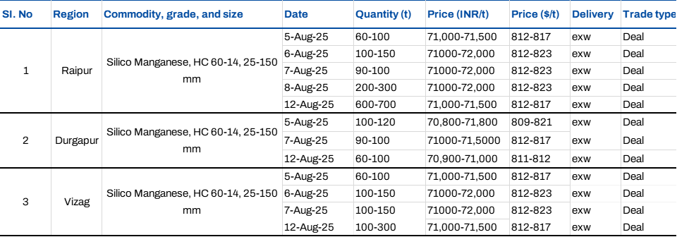 According to BigMint's assessment on 12 August 2025, domestic silico manganese prices of the 60-14 grade were recorded as follows: ex-works prices in Raipur were at INR 71,300/tonne (t) ($815/t), down by INR 400/t ($5/t), while tags in Durgapur stood at around INR 71,100/t ($812/t), down by INR 500/t ($6/t). In Vizag, prices were at INR 71,100/t ($812/t), down by INR 500/t ($6/t).