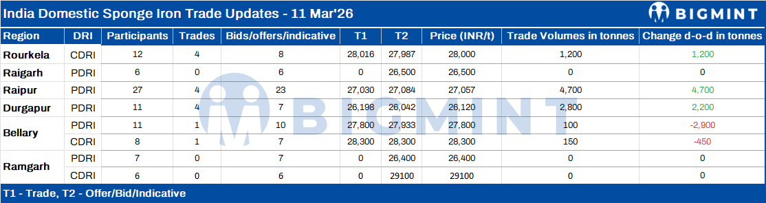 Indian sponge iron prices witnessed a down trend on 11 March. Prices fell by INR 100750/t across regions. Buying activity remained low to moderate, with limited enquiries across markets. Amid continuous price corrections, buyers largely adopted a wait-and-watch stance, leading to cautious and need-based procurement during the day, though some improvement observed in the market at late evening.