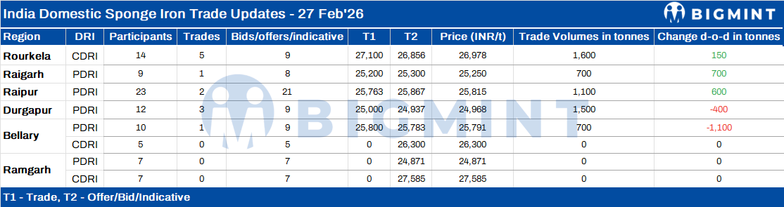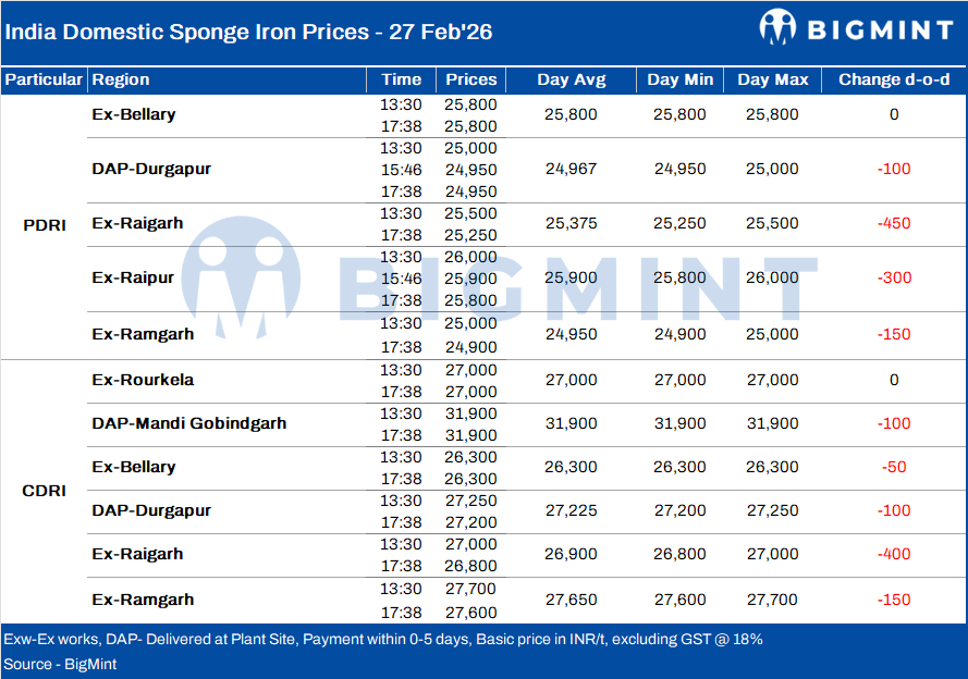 Indian sponge iron (DRI) pricesdeclined by INR 50-450/t d-o-d on 27 February 2026 across major producing regions, as subdued demand and cautious buying behaviour dominated market activity.