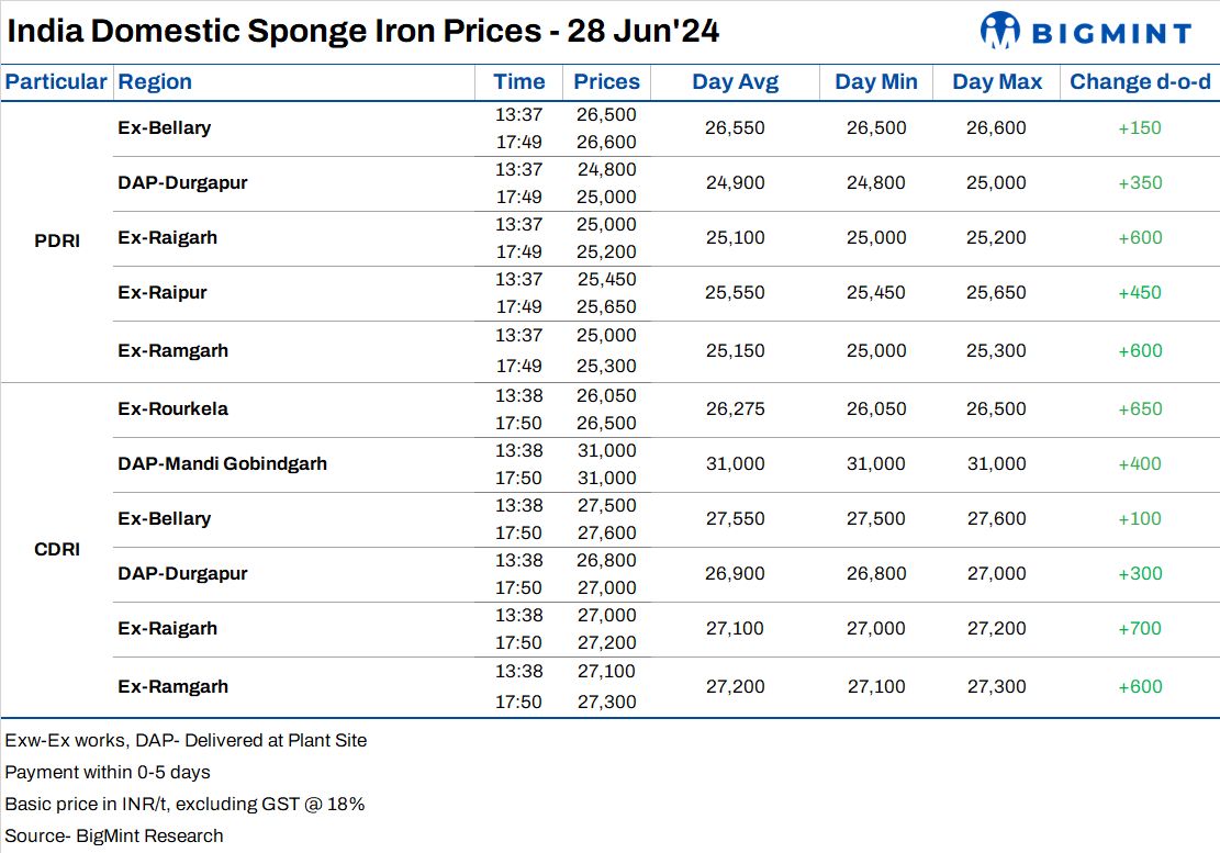 India: Sponge iron prices rise as steel prices firm up amid active demand - 28 Jun