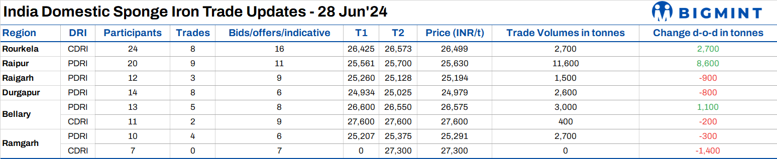 PDRI prices were assessed at INR 24,700-27,300/t at close of trading and CDRI prices at INR 26,500-31,000/t.