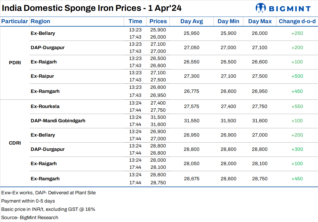 India's sponge iron market witnessed a rise in prices today ranging from INR 100-550/t in all major locations. This increase can be attributed to active spot trading coupled with buying interest.