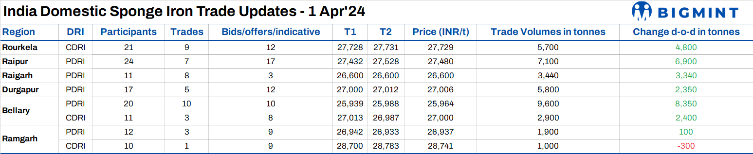 About 37,440 t of sponge iron transactions were recorded in the country on Monday compared to 9,500 t on 29 March.
