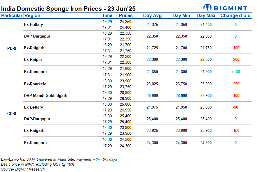 PDRI prices closed within a range of INR 21,300-25,500/t, while CDRI prices were assessed at INR 23,750-28,900/t.