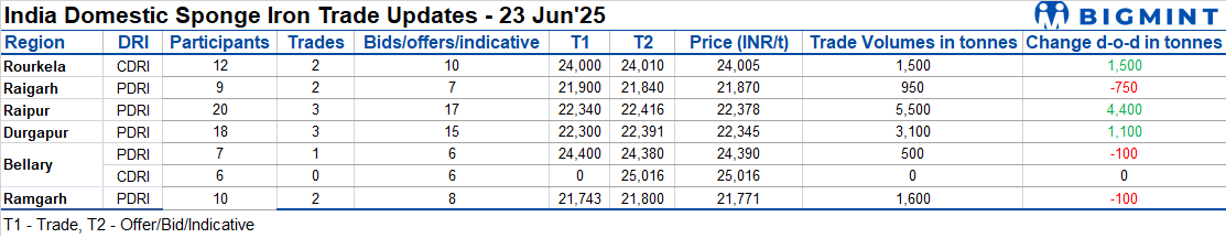 Sponge iron transactions of approximately 5,300 t were recorded today, down from 14,650 t on 21 June.