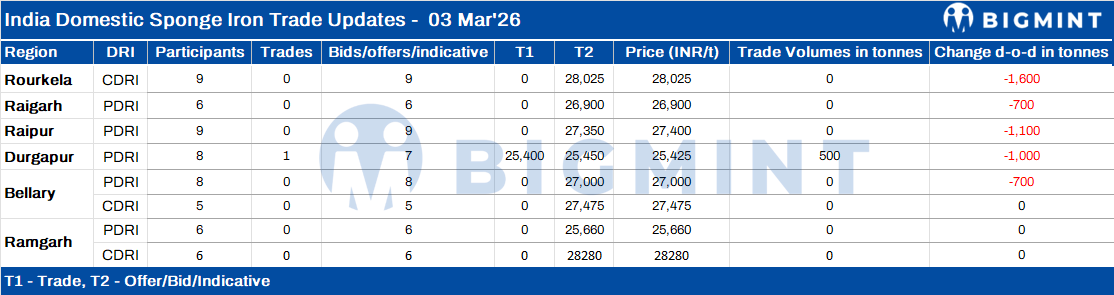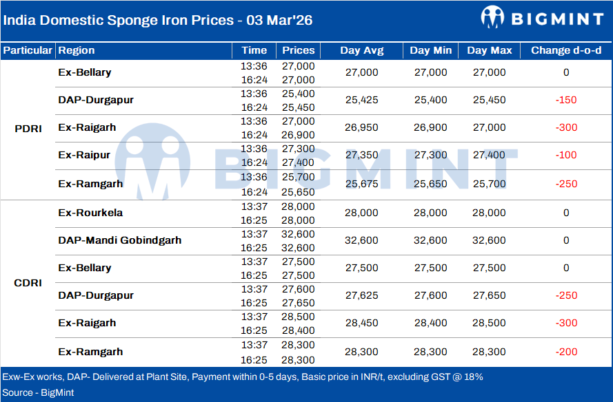 Indias sponge iron (DRI) prices remained stable or declined across various regions on 3 March 2026, with corrections limited to a narrow range of around INR 100-300/t d-o-d. The marginal correction was primarily driven by subdued trading activity ahead of the Holi festival, as buyers limited procurement, and overall market participation remained low. Most transactions during the day were need-based, with market participants adopting a cautious approach.