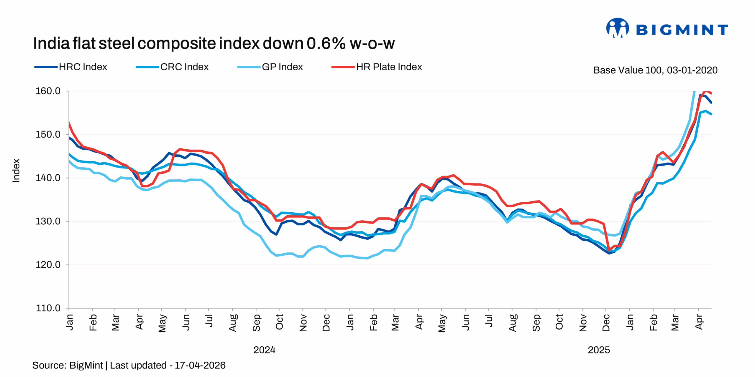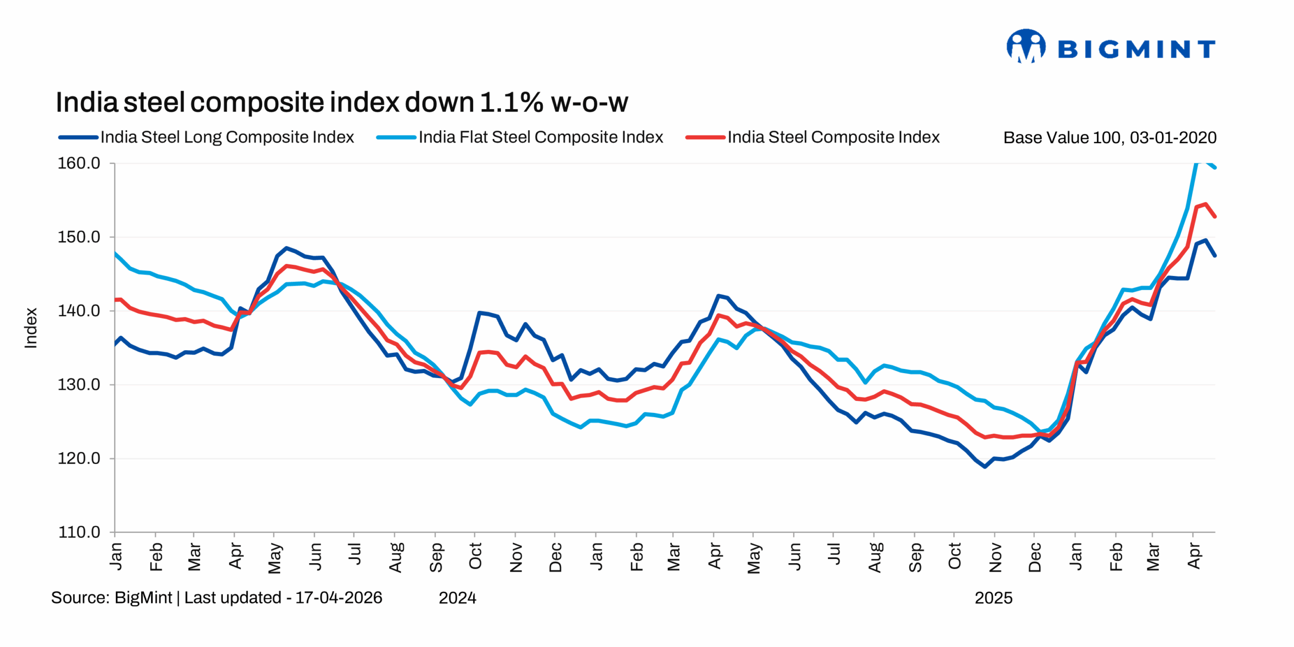 Morning Brief: BigMint's India steel composite index, a barometer of the domestic steel market, fell sharply by 1.1% w-o-w, as assessed on 17 April 2026, after a sustained rally, with the index inching up for six consecutive weeks. Steel prices corrected from an elevated level, BigMint understands, with softening raw material prices, the possibility of an end to hostilities in West Asia following a ceasefire, and the prospect of rationalisation of freight and energy costs all pointing to an impending stablisation of market conditions.