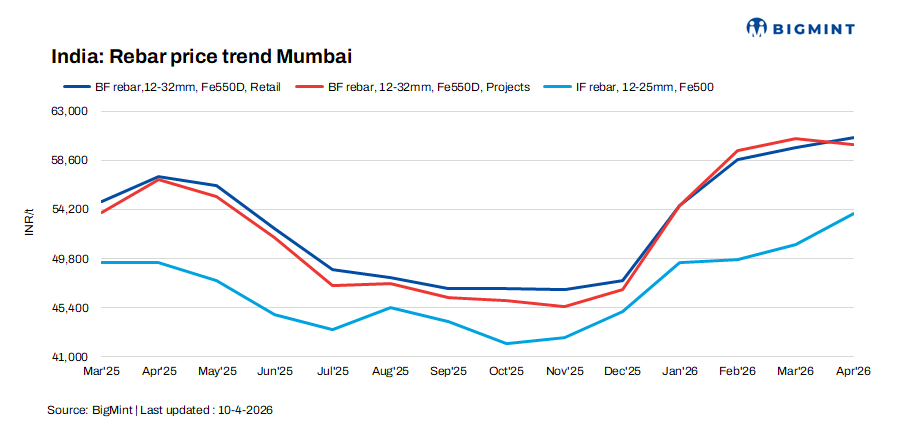 1. IF rebar prices show mixed trends w-o-w: IF rebar trade prices showed volatility across major markets this week. Prices rose initially as manufacturers raised offers supported by decent bookings and lower inventories. Meanwhile, prices witnessed a decline following a ceasefire announcement mid-week, triggering mild panic selling and weak buying interest. Buying activities remained largely need-based amid fluctuating trends. Mills had low inventory levels of around 5-8 days. Induction furnace (IF) rebar trade prices in Mumbai rose by INR 500/t ($5/t) w-o-w to INR 53,900/t ($580/t) exw as of 10 April.