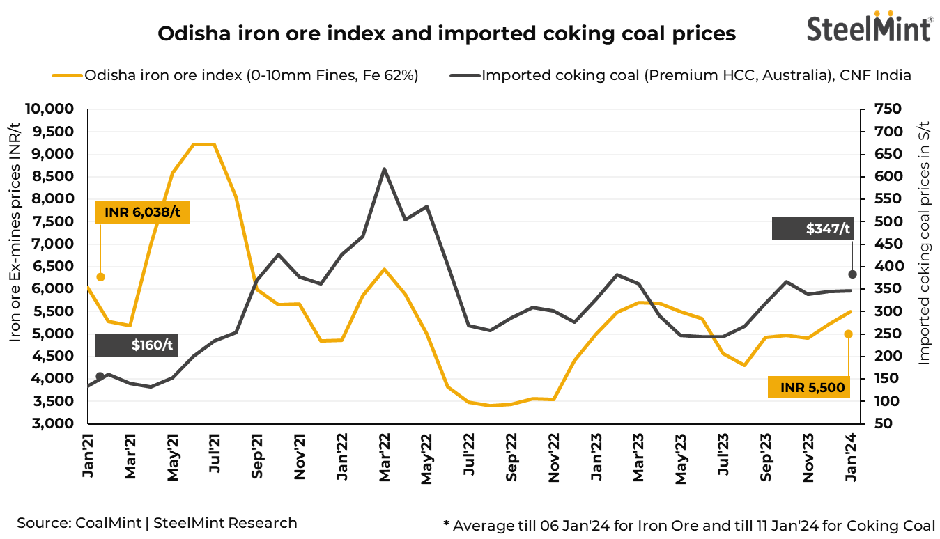 3. Raw material prices increase: The prices exhibited an upward trajectory despite market fluctuations exerting cost pressure on mills. In January 2024, the monthly average price of Odisha iron ore index (0-10mm Fines, Fe 62%) reached INR 5,500/t ($63/t) ex-mines, reflecting an increase of INR 280/t ($5/t) compared to the preceding month's closing figures. In a parallel development, the monthly average rates for imported premium hard coking coal (HCC) of Australian-origin also experienced an uptick, rising by $3/t m-o-m to reach $347/t CNF Paradip, India by the end of December.