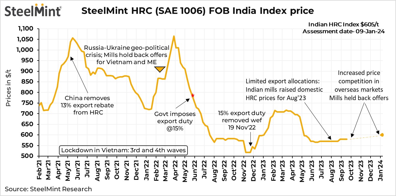 2. SteelMint's India HRC export index rises: SteelMint's India HRC (SAE 1006) export index for the Middle East and Vietnam increased to $605/t FOB east coast India, up from $600/t FOB the previous week. After a hiatus, mills re-entered the Middle East market with new offers last week, and this week saw their return to Vietnam after an extended absence.
