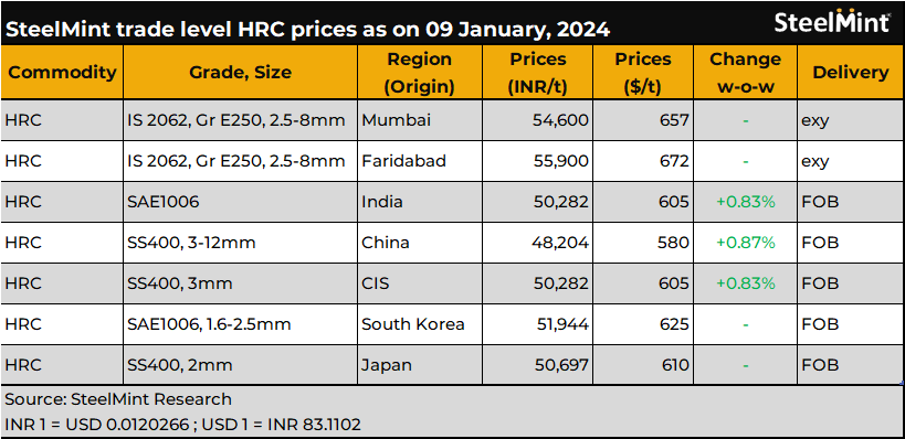 SteelMint's bi-weekly benchmark evaluation for HRC (IS2062, Gr E250, 2.5-8mm) maintained stability on 9 January, 2024, reaching a settlement at INR 54,600/t ($656/t). Concurrently, the prices of CRC (IS513, Gr O, 0.9mm) also exhibited stability, remaining at INR 62,200/t ($748/t) during the same period. (Exchange rates: INR 1 = USD 0.0120236 ; USD 1 = INR 83.1698)