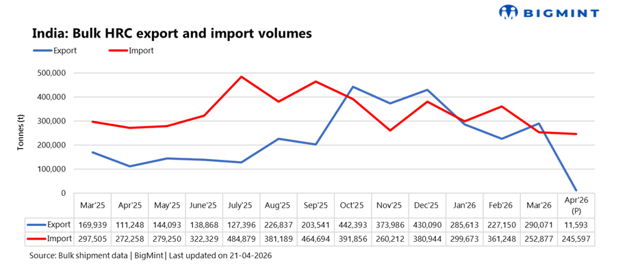Import volumes: India's bulk imports of HRCs touched 245,597 t as on 17 April. Around 11,593 t of additional cargoes are expected by early-May.