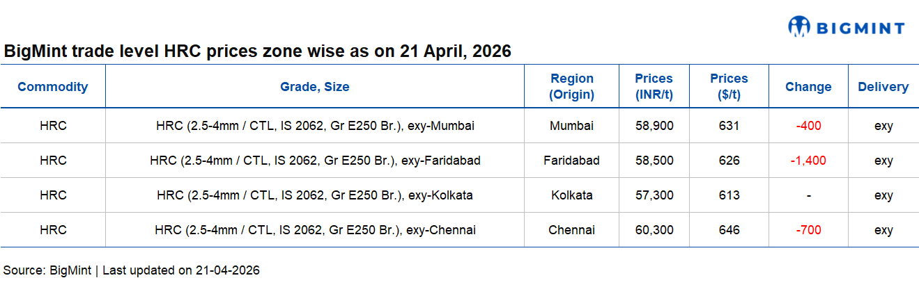 BigMint's bi-weekly benchmark assessment for HRC (IS2062, Gr E250, 2.5-8 mm/CTL) eased by INR 400/t ($4/t) w-o-w to INR 58,900/t ($630/t) as of 21 April, compared to INR 59,300/t ($643/t) on 14 April.