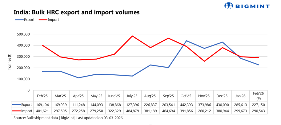 Import volumes: India's bulk imports of HRCs touched 290,543 t as of 27 February, based on vessel line-up data. Around 109,707 t of additional cargoes are expected by mid-March.