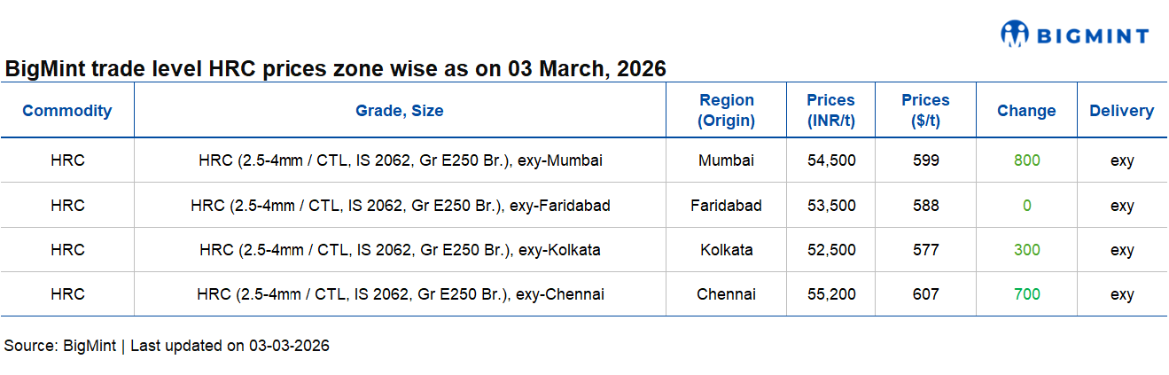 BigMint's benchmark assessment (bi-weekly) for HRC (IS2062, Gr E250, 2.5-8 mm/CTL) prices increased by INR 800/t ($9/t) w-o-w to INR 54,500/t ($592/t) on 3 March against INR 53,700/t ($583/t) in the same period last week.