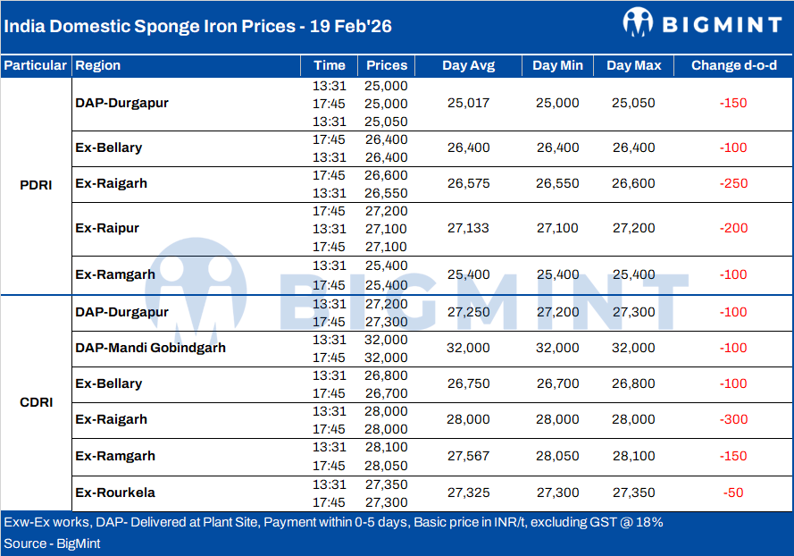 India's sponge iron market witnessed broad-based corrections on 19 February, with prices declining by INR 100-300/t day-on-day across major producing regions, as weak finished steel demand continued to dampen procurement activity.