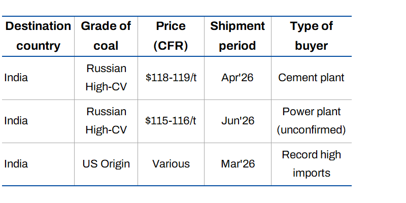 The shift is visible in actual cargo movements. Russian high-calorific value coal has been sold to Indian cement plants for April shipment at prices between $118 and $119/t CIF. These are substantial purchases, indicating a genuine change in procurement strategy. Buyers are looking at coal from the United States, Russia, South Africa, and Colombia as alternatives to petcoke.