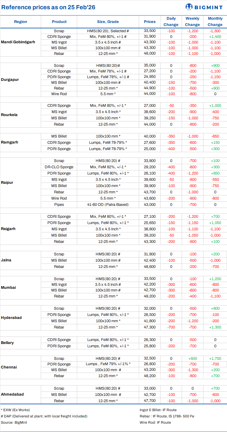 Sponge iron prices declined by INR 50-400/t d-o-d, with the steepest drop of INR 400/t recorded in Ramgarh, where prices reached INR 25,000/t.