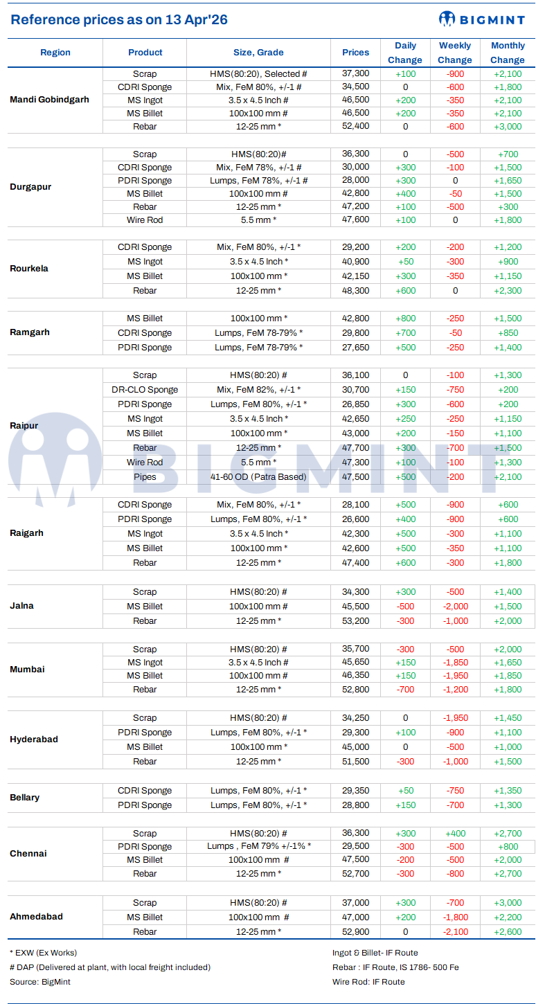 India's induction furnace (IF) steel prices showed mixed trends d-o-d across regions on 13 April.
