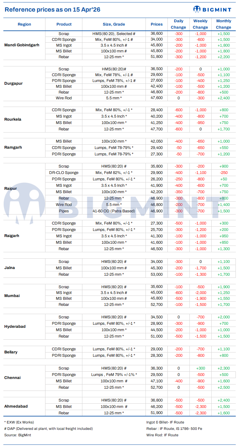 India's induction furnace (IF) steel prices edged down d-o-d across regions on 15 April 2026.