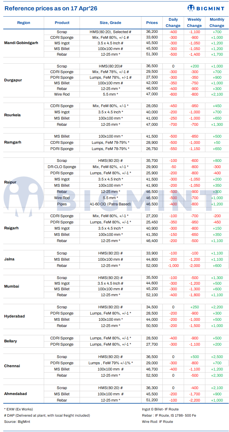 Indian DRI, billet, rebar update - 17 Apr