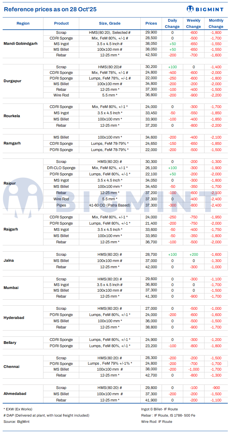 Rebar (Fe 500) tags moved down by INR 100-200/t d-o-d. Prices dropped the highest in Mandi by INR 200/t.