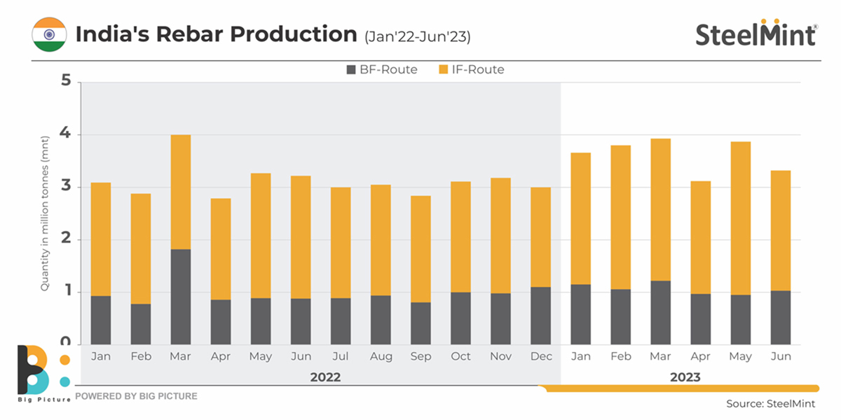 Rebar production increases: Several of the large mills increased production in the last one year. SteelMint's data reveals, while rebar output in the entire calendar of 2022 was at 37 million tonnes, volumes in the first half of January-June, 2023, touched 60% of last year's volumes at around 22 mnt.