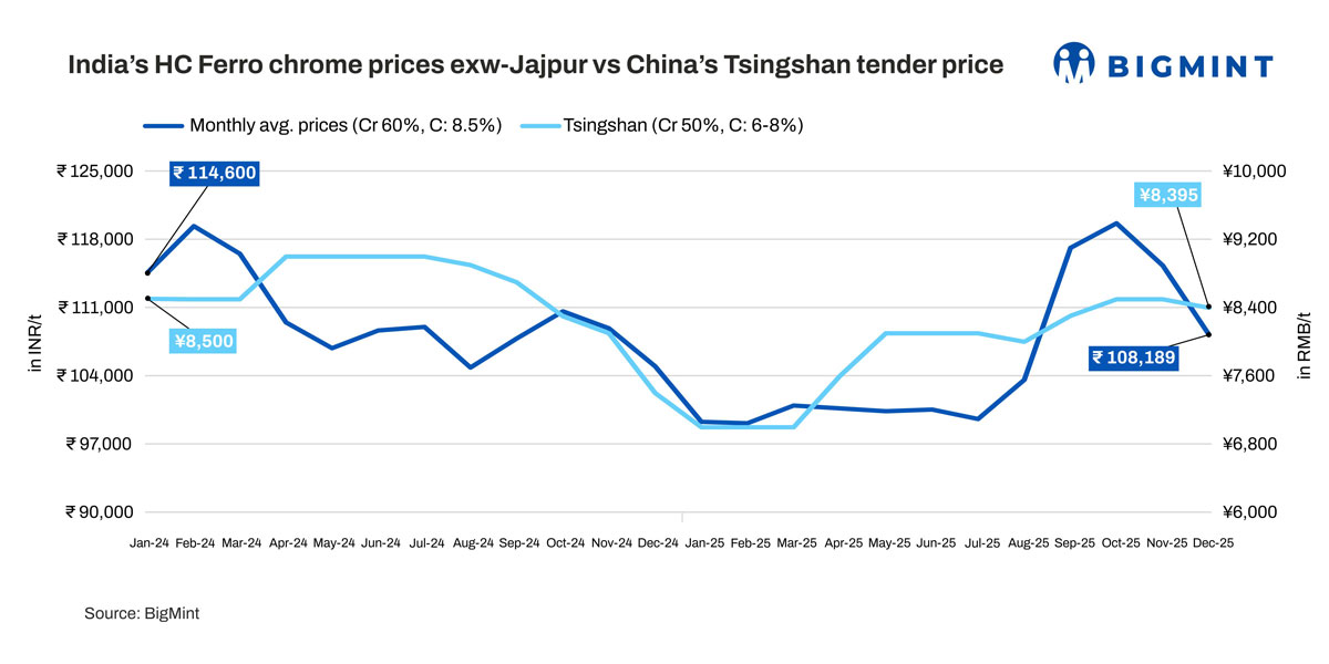 In the domestic market, average monthly high-carbon ferro chrome prices fell by about 4.4% y-o-y, or INR 4,800/t, to INR 105,300/t in CY'25.