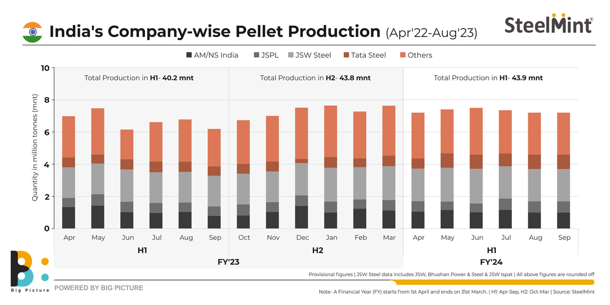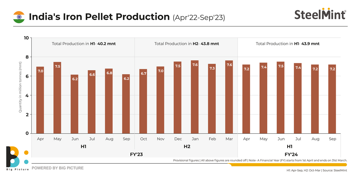 Production of iron ore pellets in India in the April-September 2023 (H1FY24) period stood at around 44 million tonnes (mnt), as per provisional data available with SteelMint. Production increased by 11% compared with over 39 mnt in H1FY23. Production in FY23 was recorded at 84 mnt, higher by 7% compared with 78 mnt in FY22.