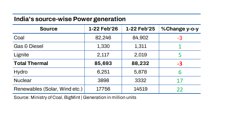 India's electricity data for the first 22 days of February 2026 shows that the country's power demand is still growing. Total electricity generation increased slightly compared with the same period last year. But the big change is not the total number -it is where the electricity is coming from. Renewable energy and nuclear power are growing fast, while coal use has fallen a little.