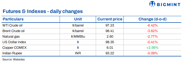 While oil prices recorded a notable decline, with Brent crude falling by 3.62% to $98.41/bbl, prices still remain sharply elevated compared to prices before the US-Iran conflict began. Natural gas prices also declined by 2.77% to $2.60/MMBtu.