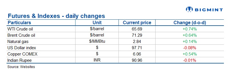 Warehouse inventory trends were mixed. Aluminium stocks decreased 0.42% to 469,550 t, while nickel inventories edged up 0.17% to 287,808 t and zinc stocks fell 1.41% to 99,825 t. Meanwhile, copper inventories rose 2.66% to 249,650 t, whereas lead stocks declined marginally by 0.01% to 286,300 t.