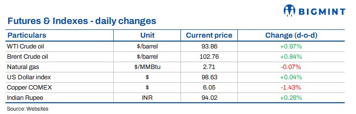 Crude oil prices strengthened sharply, with Brent crude rising above $100/bbl for the first time in over two weeks on Wednesday, as no progress was reported in US-Iran talks and supply risks intensified in the Strait of Hormuz. The geopolitical stand-off continued to support bullish sentiment across global energy markets.
